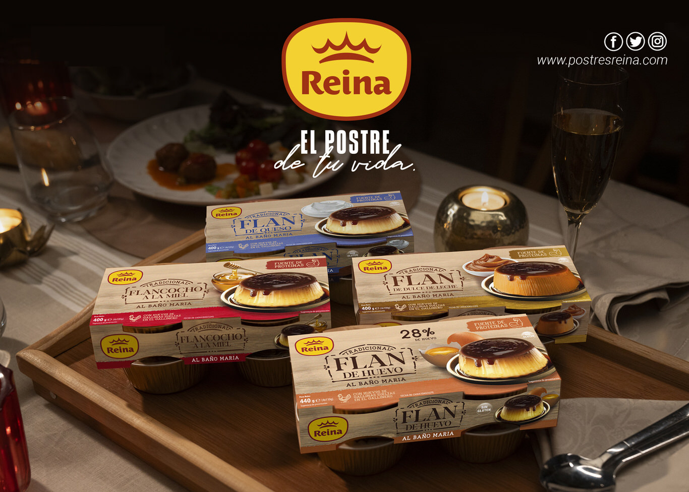 Con “Reina, el postre de tu vida”, la compañía de postres y yogures quiere mostrar tantos años en los que Reina ha estado presente con sus postres en los hogares españoles, en los momentos de la vida de tantas personas y que asocian ese instante del placer de disfrutar de un buen postre con momentos bonitos.